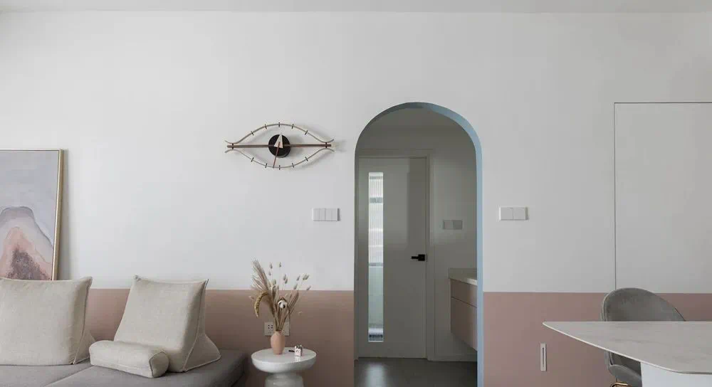 偶尔在双拼色的墙面,打破规则的挂画或者装饰,让空间更加生趣。(注意装饰画或者墙饰可以刻意压线。)